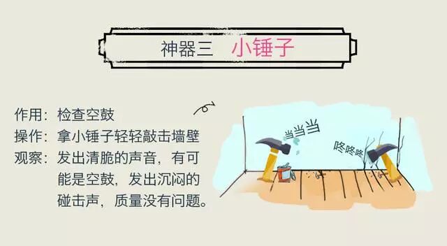 验房流程小伙伴们在接到房地产商的入住通知后,可按通知上约定的日期前往验收房子。 1、检查房屋手续 检查入住的房屋是否是自己所购买的房屋,如与购房合同、附件及补充协议不符,入住前要向房地产商提出,重新核对并进行更换;不要忘记向开发商索要“三书一证一表”查看有关部门质量验收结果,缺一不可,同时提供自己的收房资料; 2、确定房屋面积 面积发生误差应在入住前根据合同的约定向房地产商提出自己的主张; 3、看房屋结构 自己对房屋质量进行检查,如发现结构问题,应在入住前向房地产商提出,并向政府有关部门反映;如发现非结构性问题,应和房地产商交接时如实做好书面记录,并要求房地产商书面承诺在一定的期限内进行维修; 对开发商提供的文件一定认真细致地检查 4、清点房屋使用情况 按购房合同、附件及补充协议的约定对房屋内的设备进行清点,检查水、电、气、热等设备完好程度及使用状况,如有不符或缺损,应在交接时要求房地产商在交接清单上注明,并要求房地产商书面确认具体更换和配齐的日期。 5、确定房屋物业情况 对房地产商提供的物业交付核验单或交屋单中无法确定的事项,应注明“暂不清楚”或“无法认定”,并由双方在注明处签字或盖章。 验房工具一般精装房都有专业的验房师带着大家去检测,他们常备的工具有:红外线水平仪(检查墙面与墙面是否水平)、对角检测尺(检查方形物体两对角线长度对比偏差)、垂直水平尺(垂直度、水平度、平整度检测)、直角尺、靠尺、塞尺、线轴、验电插座(检查电路线序)、万用表等。 除了以上这些,我们自己可以准备一些平常但很实用的验房神器: 验房细节1、楼地面是否平整 想查看楼地面是否平整,只需要要用长尺(或者带有水平的专用直尺),靠墙壁地面,检查是否平整,同时观察是否有划痕裂纹,墙面是否有爆点(爆点:生石灰在发成熟石灰时因搅拌不匀未发好,抹在墙上就会形成爆点,用铁器敲打“爆点”时,就会发现大面积的疏松、脱落等质量问题。) 2、墙面是否有裂痕 检查墙面是否平整的同时,还需要看墙面是否有裂痕(常见的四大裂痕:强度裂缝、沉降裂缝、温度裂缝、变形裂缝)、是否有外漏的铁丝网、钢筋。如果在验房时发现以上的墙面问题,可以终究开发商帮忙修补后在签字。 3、室内楼梯是否有缺损 主要看楼梯的平整性,是否有缺损。 4、门窗安装轨道是否顺畅 在门窗检查方面,最主要的就是检查门窗的轨道是否顺畅。特别是平开窗的亲们,一定要注意能否关严实。否则会有风进入房内,特别是在寒冷的北方,那么在冬天你们就惨了。如果再验房时发现的这些问题,直接通知开发商,他们会很快就修理好了,如果你已经签字后,再找开发商处理这些问题。那么他们的办事效率就是龟速了。