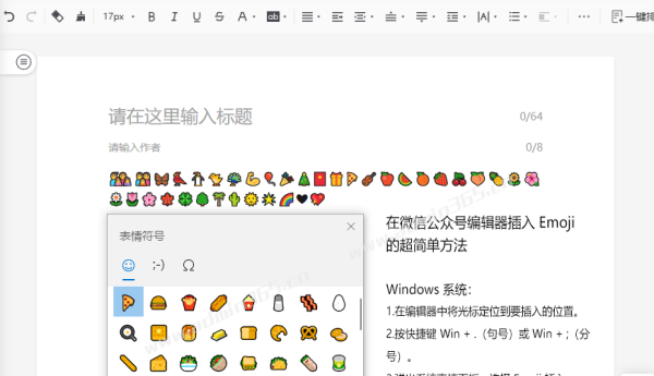 在word文档或网页文档编辑器中插入 Emoji(表情符号)的方法 一、系统快捷键法(最快,推荐) 不管是 Windows 还是 Mac,用系统自带快捷